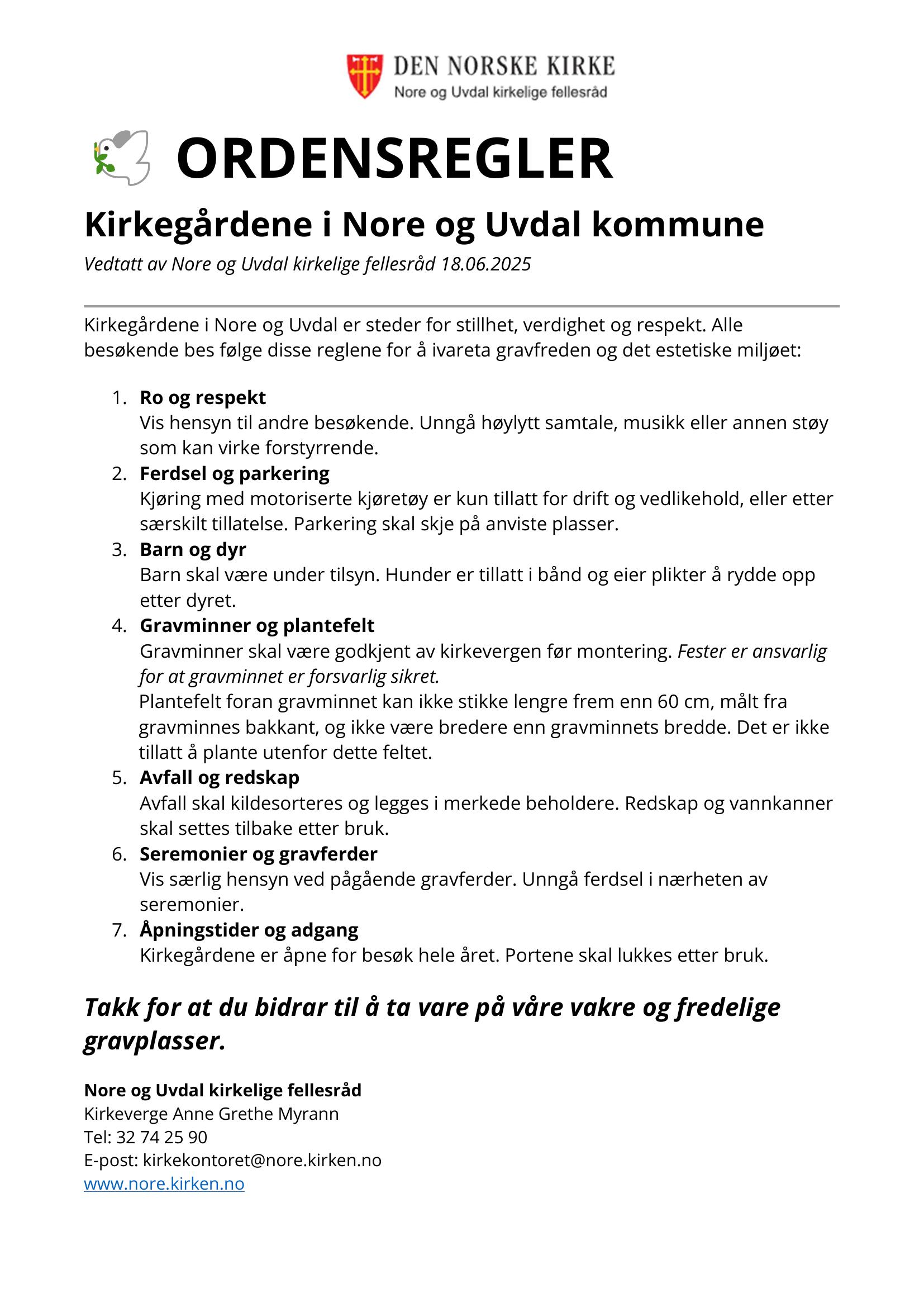 Trykk her for å se ordensreglene som ble vedtatt i Nore og Uvdal kirkelige fellesråd 18.06.2026: Ordensregler på kirkegårdene i Nore og Uvdal